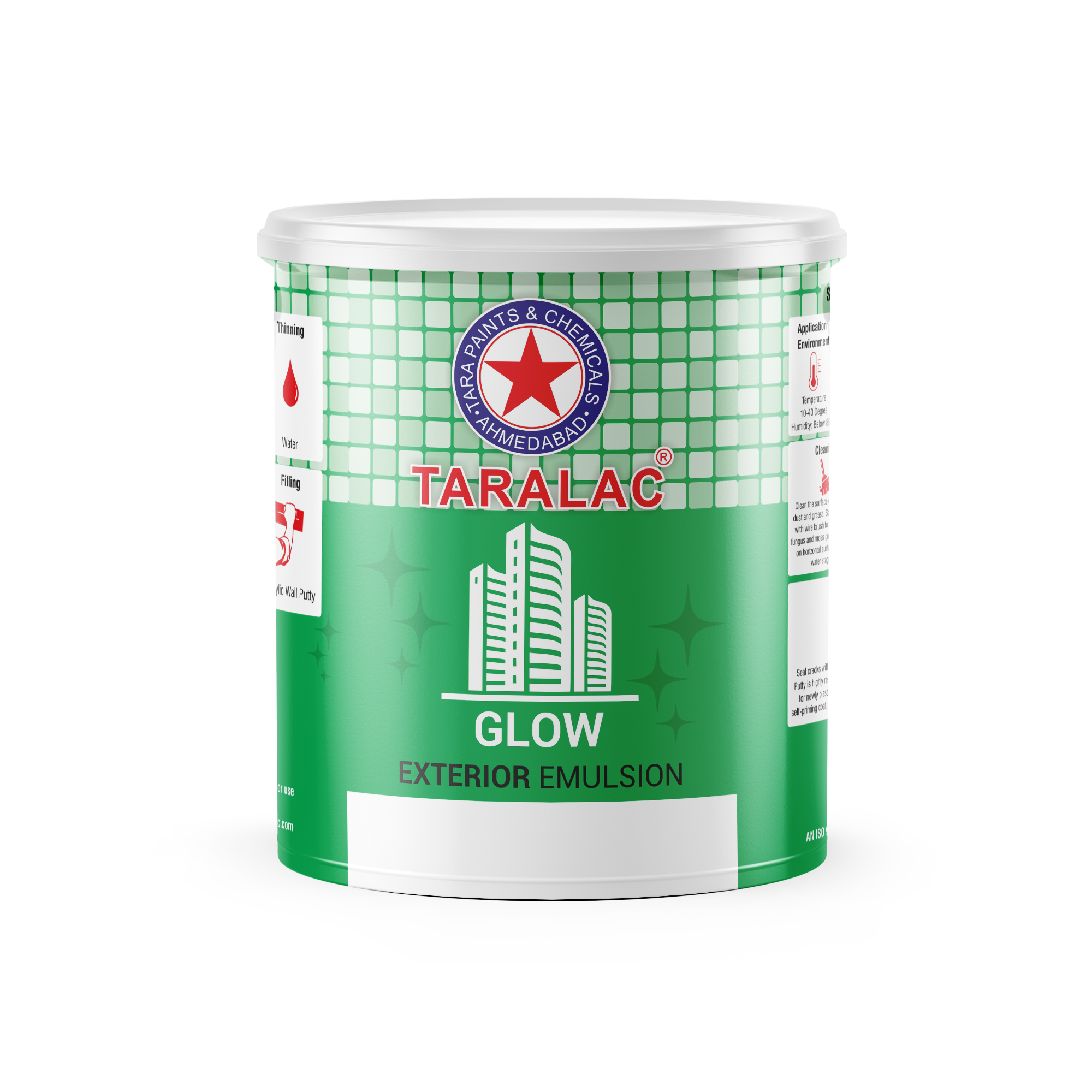 TARALAC Glow Exterior Emulsion is water-based, modified acrylic exterior wall finish that impart a hi-sheen finish to the exterior wall for use in dry to moderately humid climatic conditions.